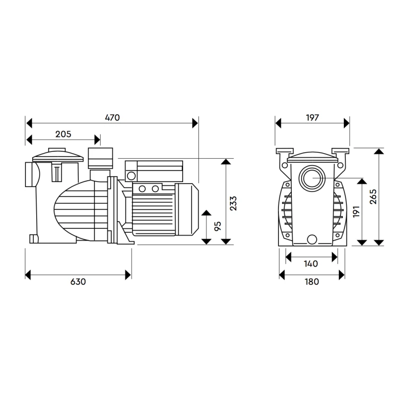 En el siguiente dibujo, podemos ver todas las medidas de la bomba de filtración. Las dimensiones están indicadas en milímetros (mm).