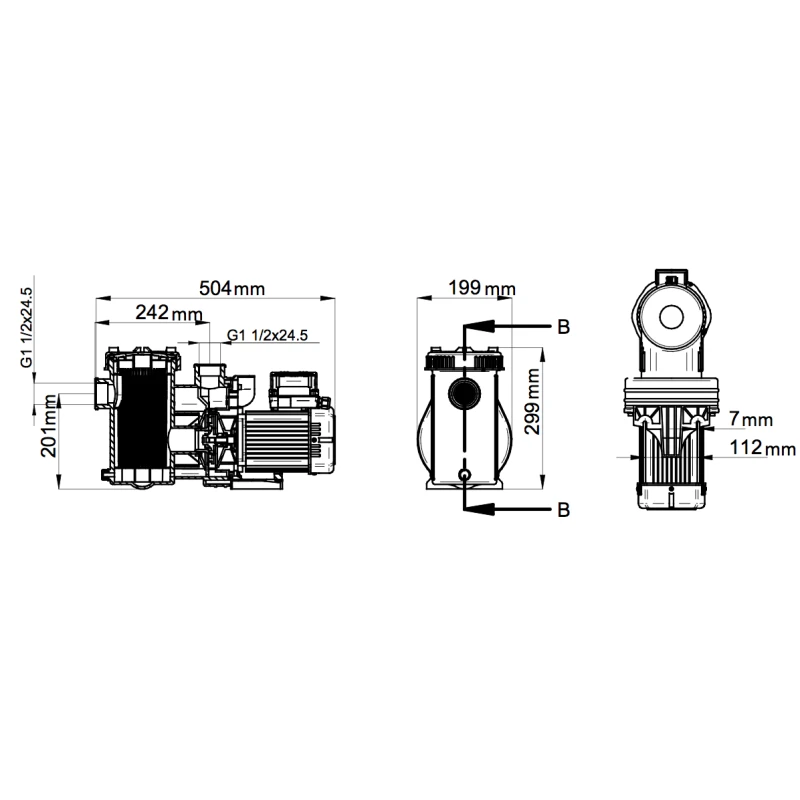 En el dibujo, podemos ver todas las medidas de la bomba de filtración. Las dimensiones están indicadas en milímetros (mm).