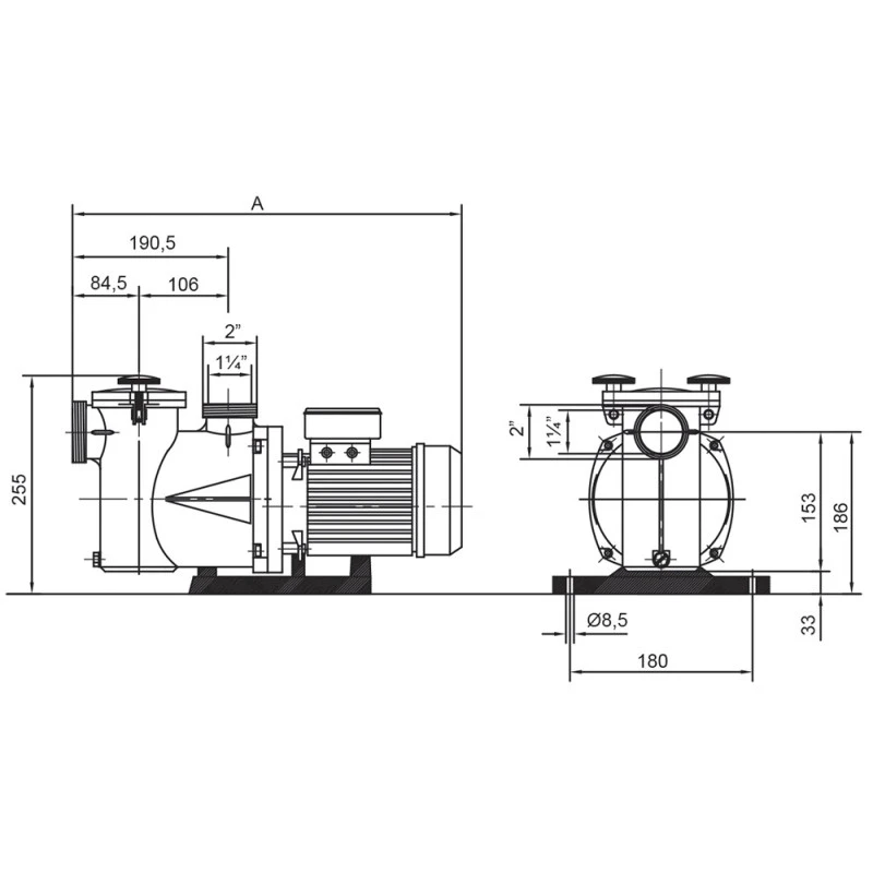 En el dibujo a continuación, podremos ver todas las medidas de la bomba de filtración Ninfa NK Kripsol. Las medidas están indicadas en milímetros mm y toda la gama tiene las mismas.