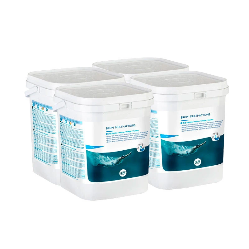 El bromo multiacción en pastillas para el tratamiento del agua de piscinas combina la acción lenta, antialgas y bactericida en un mismo producto. Una de sus principales ventajas con respecto al cloro es que no daña la piel no el cabello, además de reducir el olor.