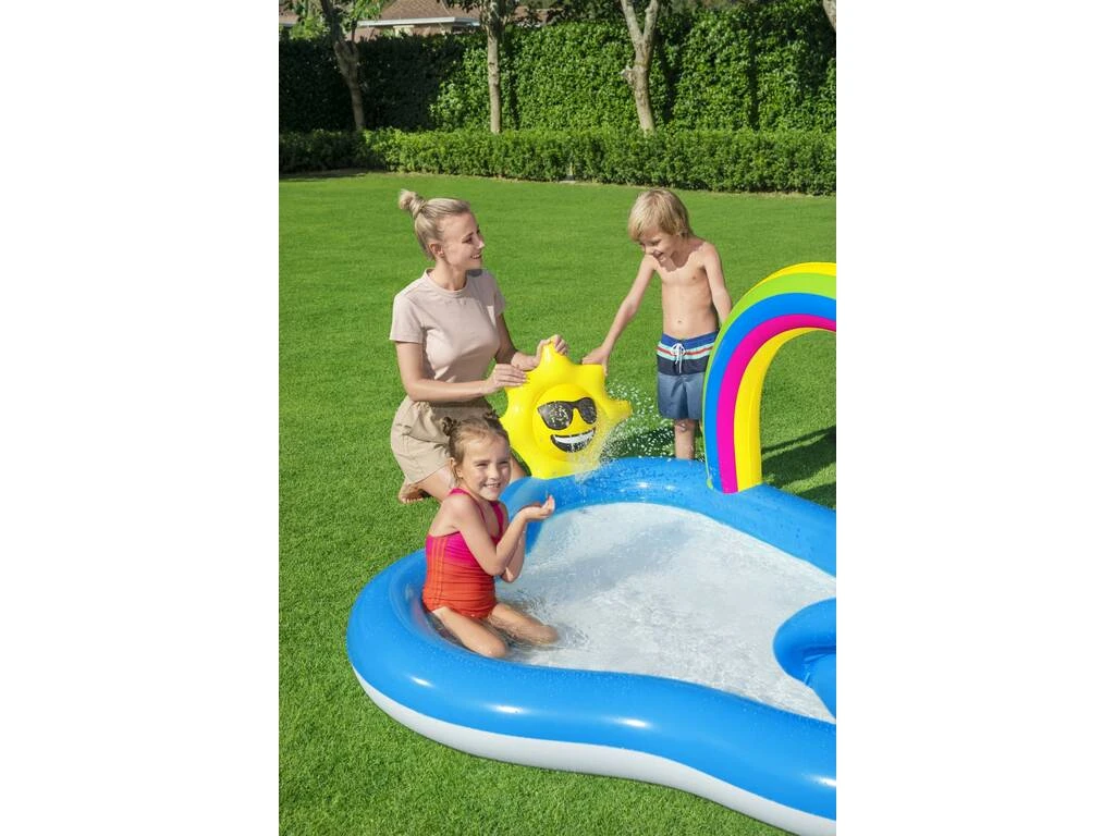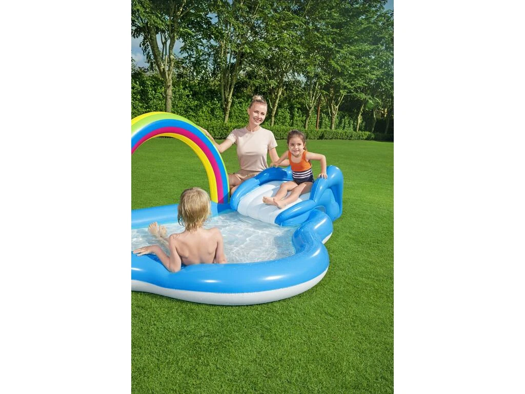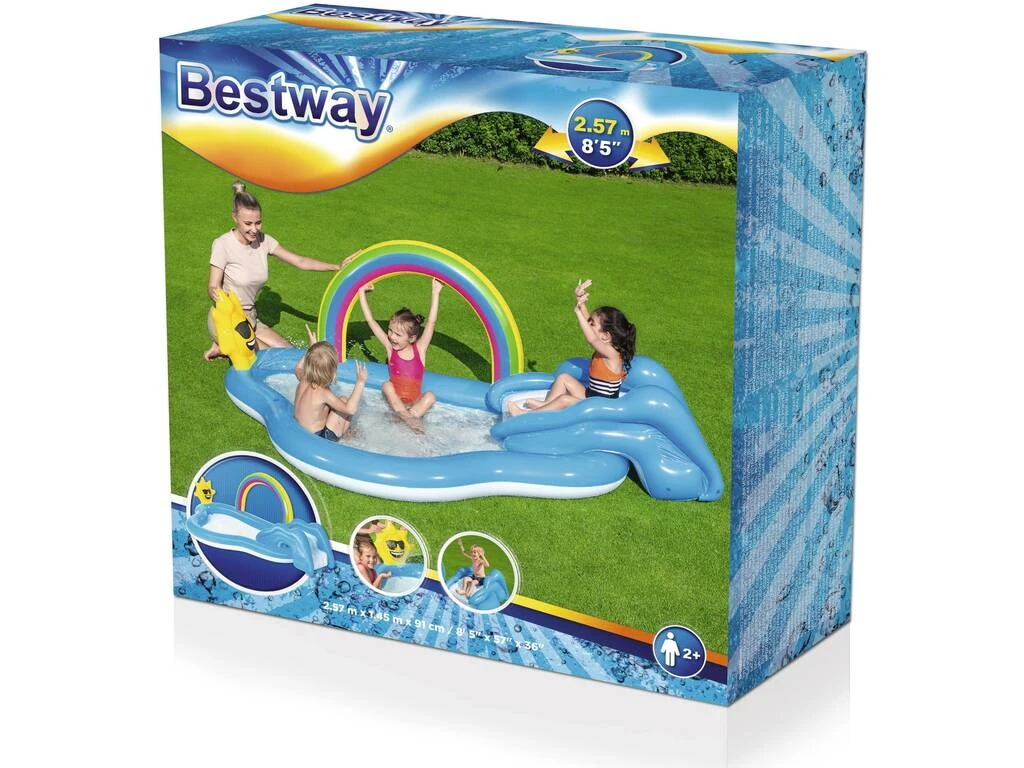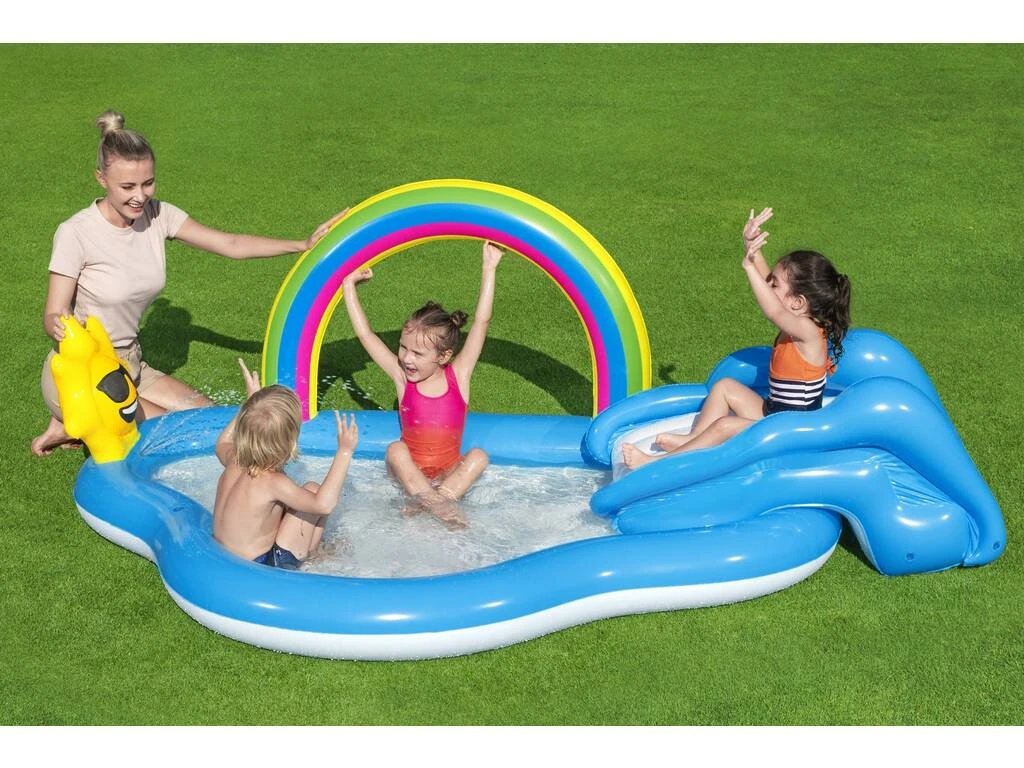 ¡Disfruta viendo a los peques en una zona de lo más refrescante y divertida! ¡Gracias a este Centro de juegos Arcoíris con Tobogán 247x145x91 cm de Bestway!