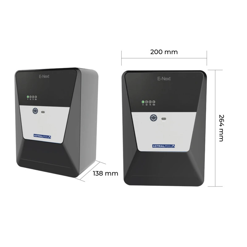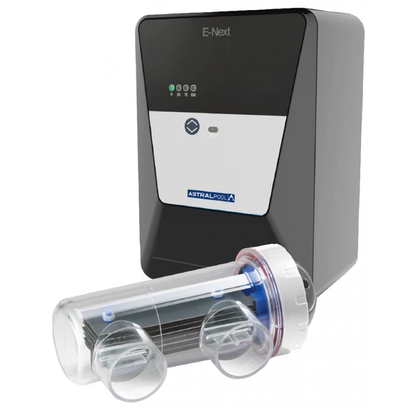 Astralpool presenta el clorador salino E-Next es responsable de la desinfección automática de la piscina (hasta 180 m³) es fácil de instalar y usar, compatible con equipos de control de pH y pueden ser instalados posteriormente. Según los m³ de la piscina, debes elegir el modelo que mejor se adapte a sus necesidades. Está disponible en 5 modelos a elegir: 30 m³ / 50 m³ / 90 m³ / 140 m³ y máximo 180 m³.