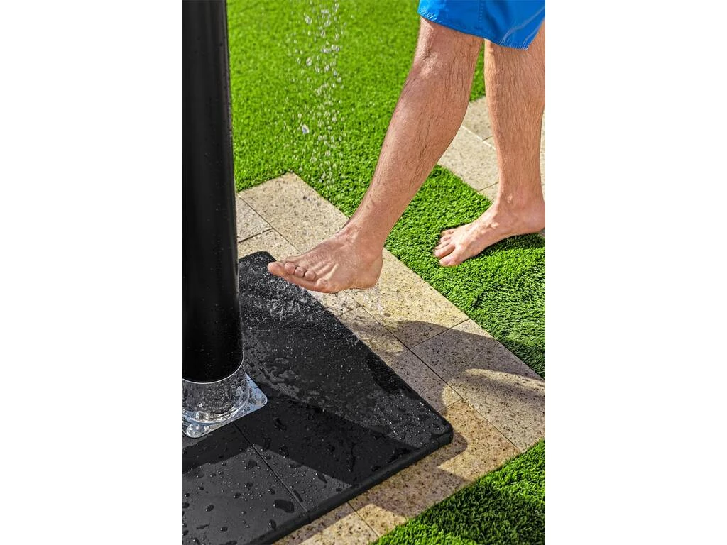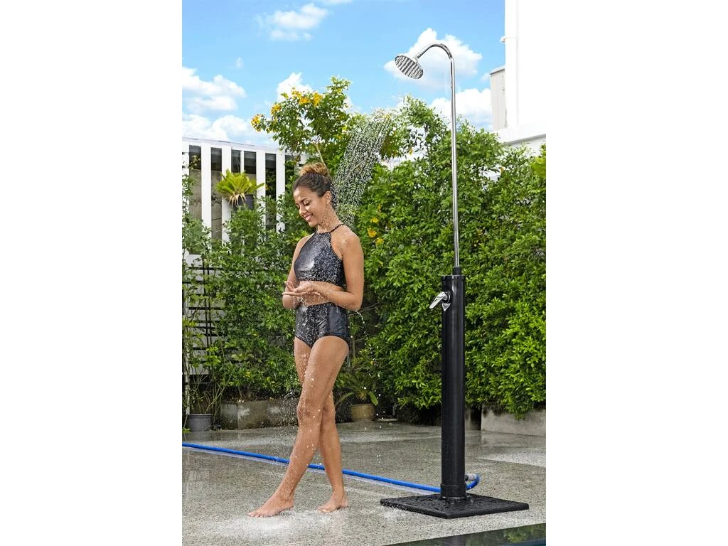 Incluye: 1 ducha solar de exterior SolarFlow de color negra con gran depósito de agua, sistema de instalación fácil con base para la mayoría de las superficies, mango de flujo de agua con temperatura ajustable y conector rápido para manguera de jardín (no incluida).