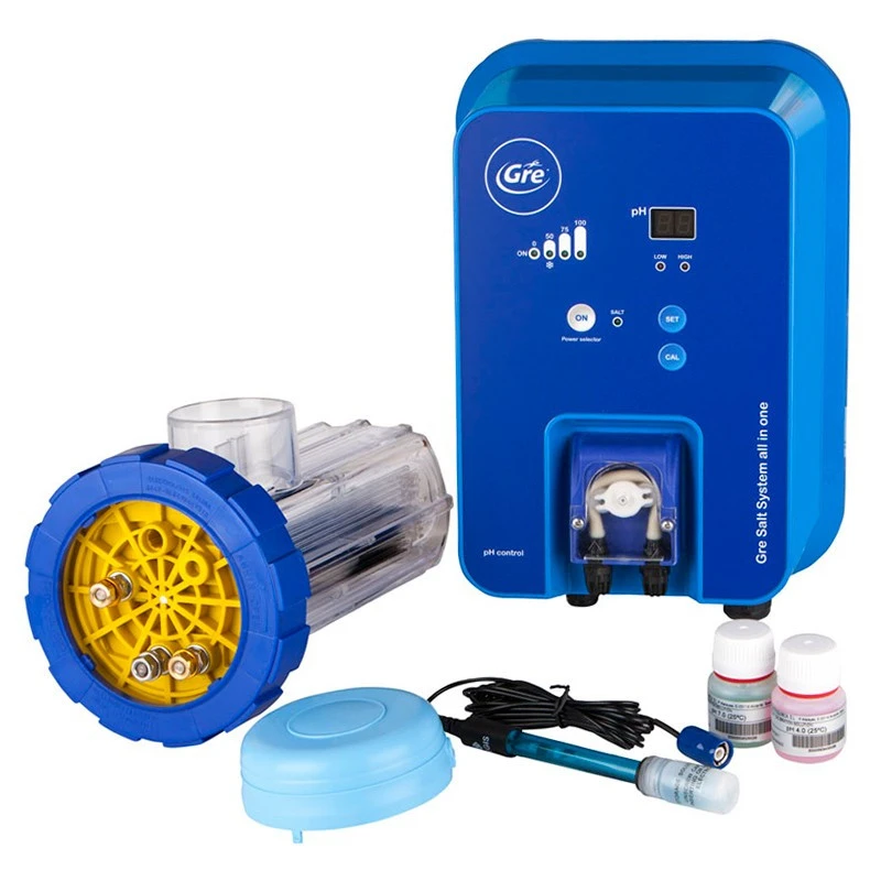 Electrólisis salina All In One del fabricante Gre con referencias SCGPHP60 y SCGPHP100 vienen equipados con una bomba dosificadora y controlador de pH, diseñada para piscinas de diferentes dimensiones (comprobar en cada ocasión la electrolisis adecuada para su piscina, a tener en cuenta, dimensiones y bañistas), pudiendo evitar en casi su gran parte el uso de producto químico en agua y conservarla en condiciones ideales. Incorporando sistema de desinfección mediante sal de piscinas natural.