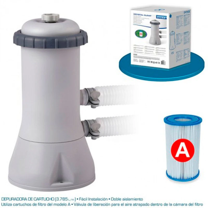 Sistema de filtración por cartucho con una capacidad de filtración de 3.785 l/h recomendada para piscinas de 15.000L a 17.000L para piscinas elevadas tanto de PVC como para piscinas más resistentes como el acero. Los tubos que lleva esta depuradora tienen un diámetro de 32 mm.
