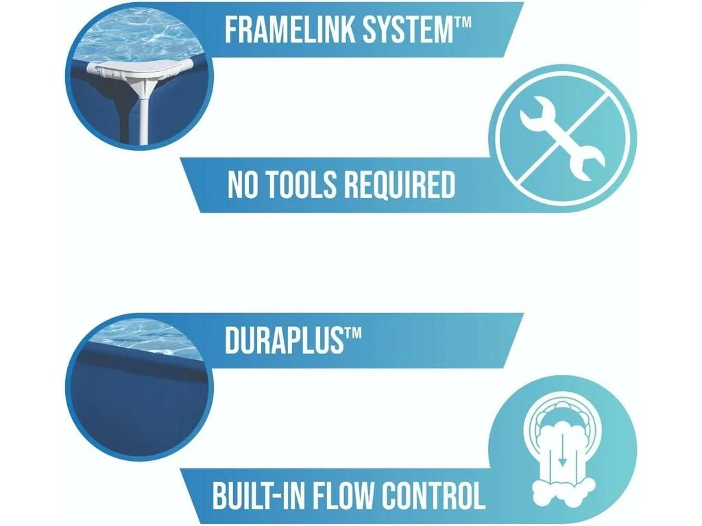 Liner con tecnología DuraPlus: 3 capas reforzadas de poliéster con láminas de PVC que ofrecen mayor resistencia y durabilidad ante la presión del agua, rayos solares y productos químicos.