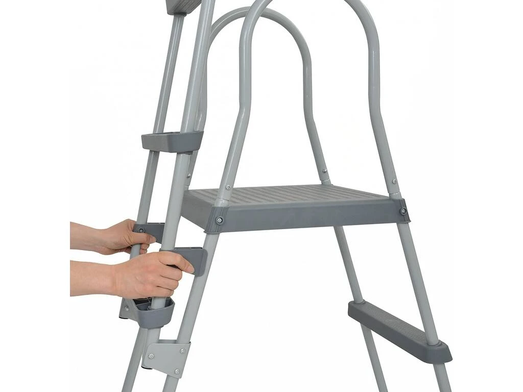 Incluye: Una caja de almacenaje, una piscina desmontable de 360×122 cm, una depuradora, una cubierta, un tapiz, una escalera, un filtro de cartucho y un manual de instrucciones de montaje.