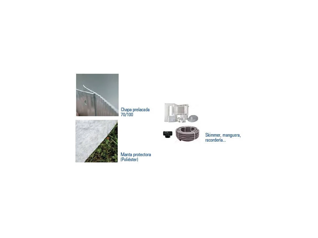 El kit incluye depuradora de arena, escalera de acero inoxidable, manta protectora de suelo y accesorios (skimmer, manguera, racordería, etc.).