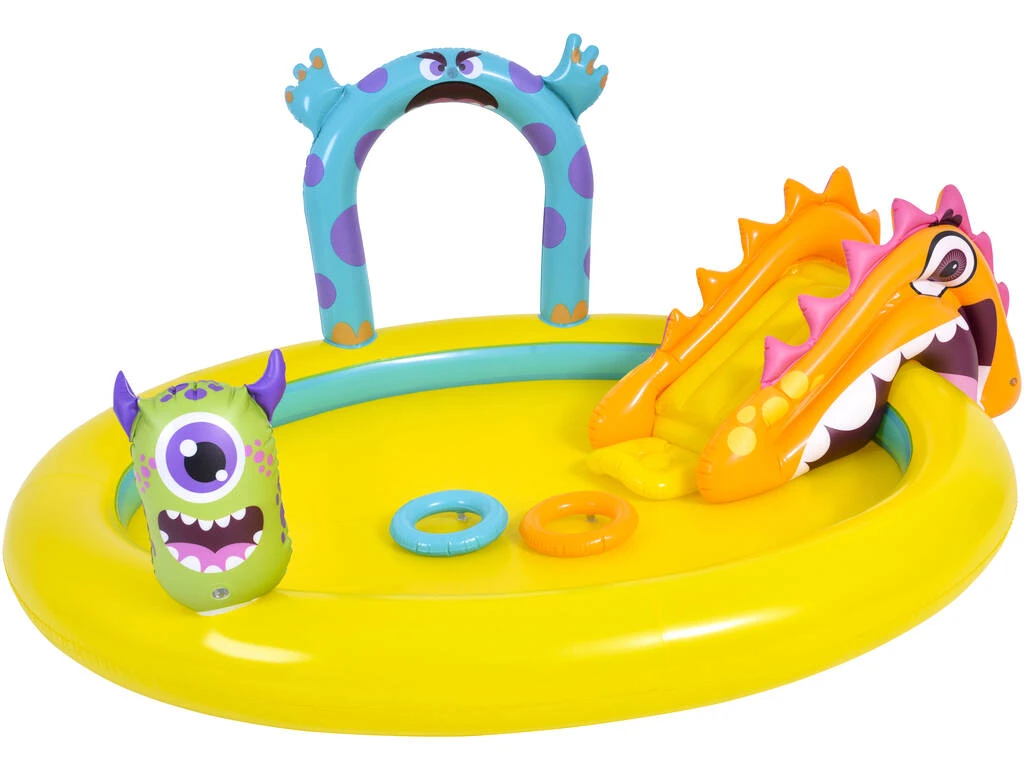 Hazte con esta genial piscina infantil hinchable, fabricada en materiales de alta calidad y resistencia, en la que se incluye un práctico tobogán hinchable sobre el que deslizarse, aros hinchables y mucho más. La diversión está garantizada de la mano de estos coloridos monstruos y la piscina más genial.