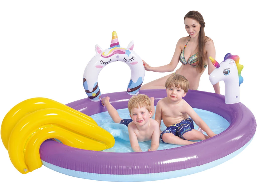 Consigue esta nueva y mágica piscina hinchable infantil, un lugar lleno de zonas de juego, con un estilo de lo más dulce y diferentes zonas de juego como el tobogán hinchable, el arco rociador de agua y muchas más sorpresas. Encuentra un lugar especial y seguro donde instalarla, llénala de aire y agua, y sorprende a los peques con un Verano muy refrescante y divertido.