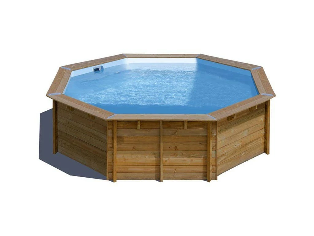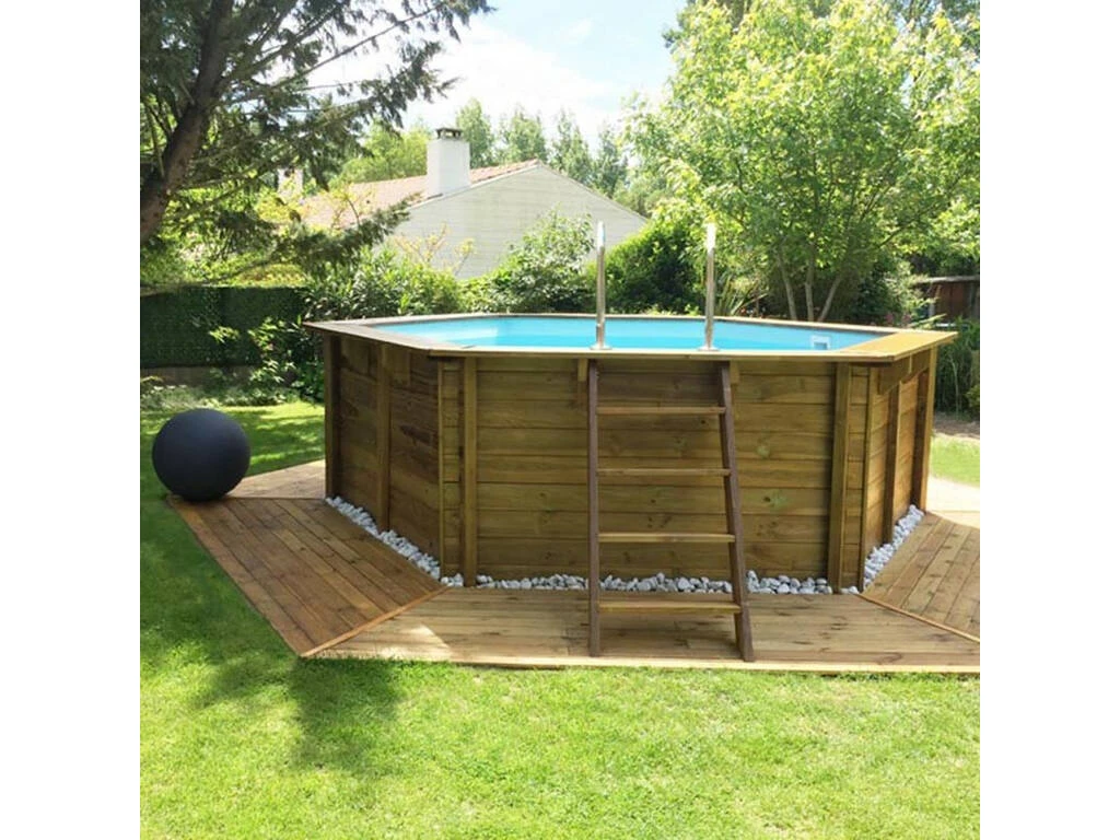 Incluye: Piscina de madera redonda Ananas con espesor de 46 mm, escalera exterior de madera, escalera interior de acero inoxidable, protector de pared, protector de fondo de 200 g/m², depuradora de arena con caudal de 6.000 l/h y liner espesor 75/100.