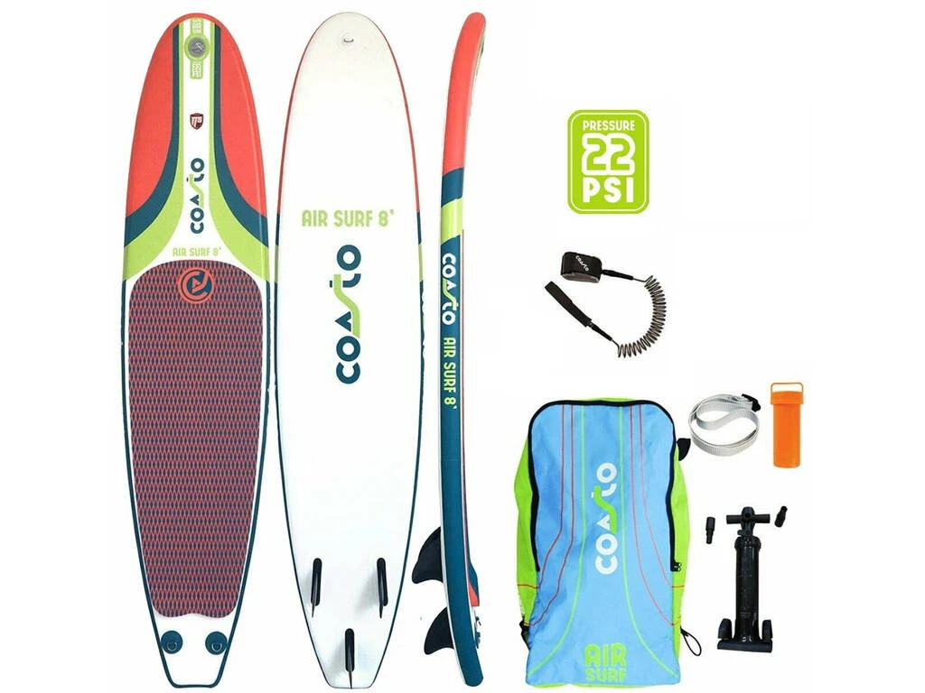 Incluye: 1 tabla de surf hinchable Coasto Air Surf 8, 1 funda de transporte, 1 bomba de doble acción de alta presión plegable, 1 corra en espiral, 1 cinturón de sujeción y 1 pack de reparación de pinchazos.