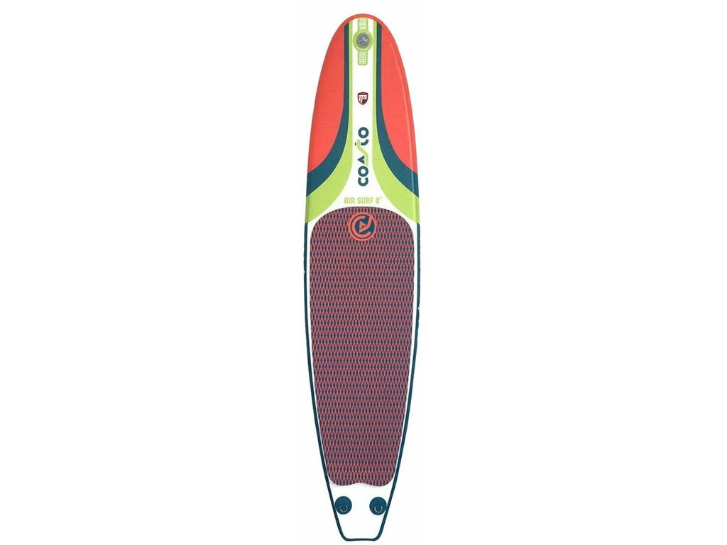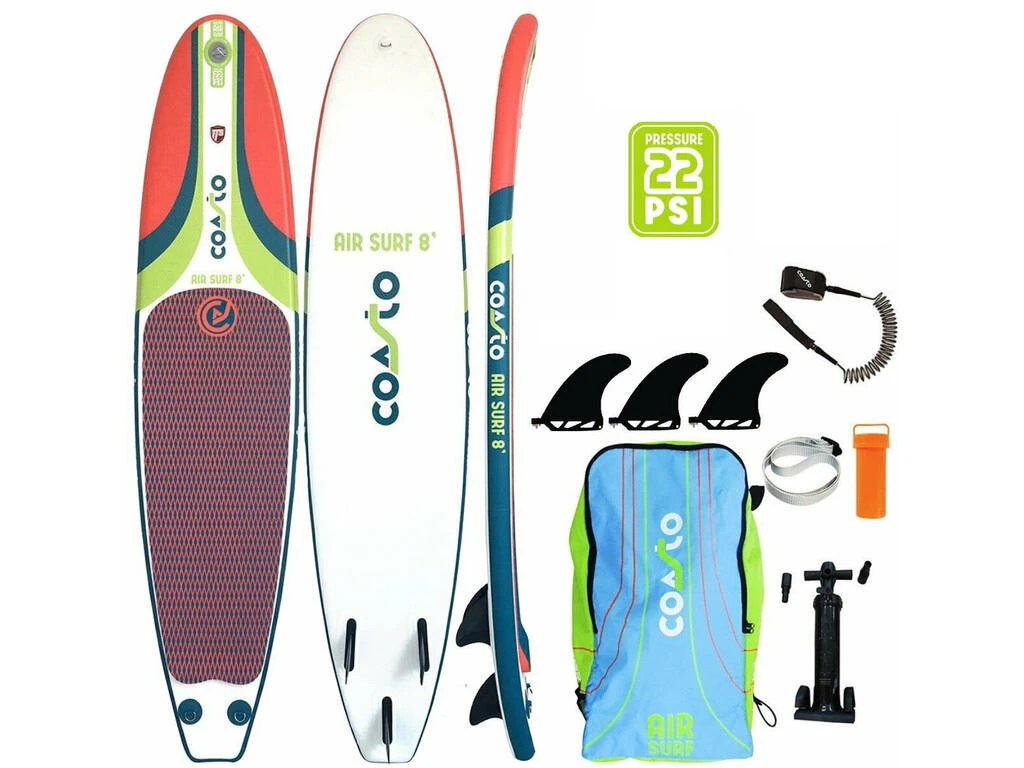 Incluye: 1 tabla de surf hinchable Coasto Air Surf 8, 1 funda de transporte, 1 bomba de doble acción de alta presión plegable, 1 corra en espiral, 1 cinturón de sujeción y 1 pack de reparación de pinchazos.