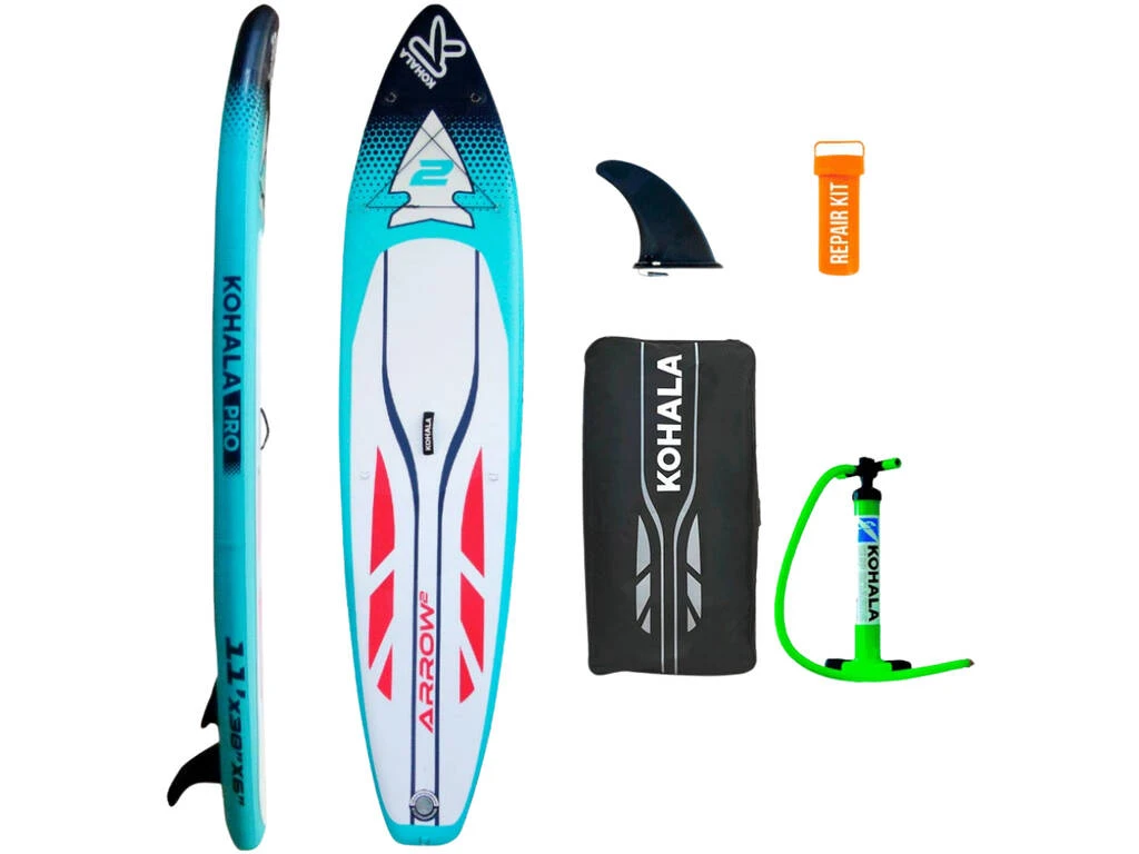 – El pack incluye: 1 tabla hinchable de Paddle Surf Stad-Up Kohala Arrow 2 de color azul con 3 aletas (1 central y 2 laterales), 1 bomba de hinchado de doble acción, 1 bolsa de transporte, 1 correa especial elástica y 1 kit de reparaciones.