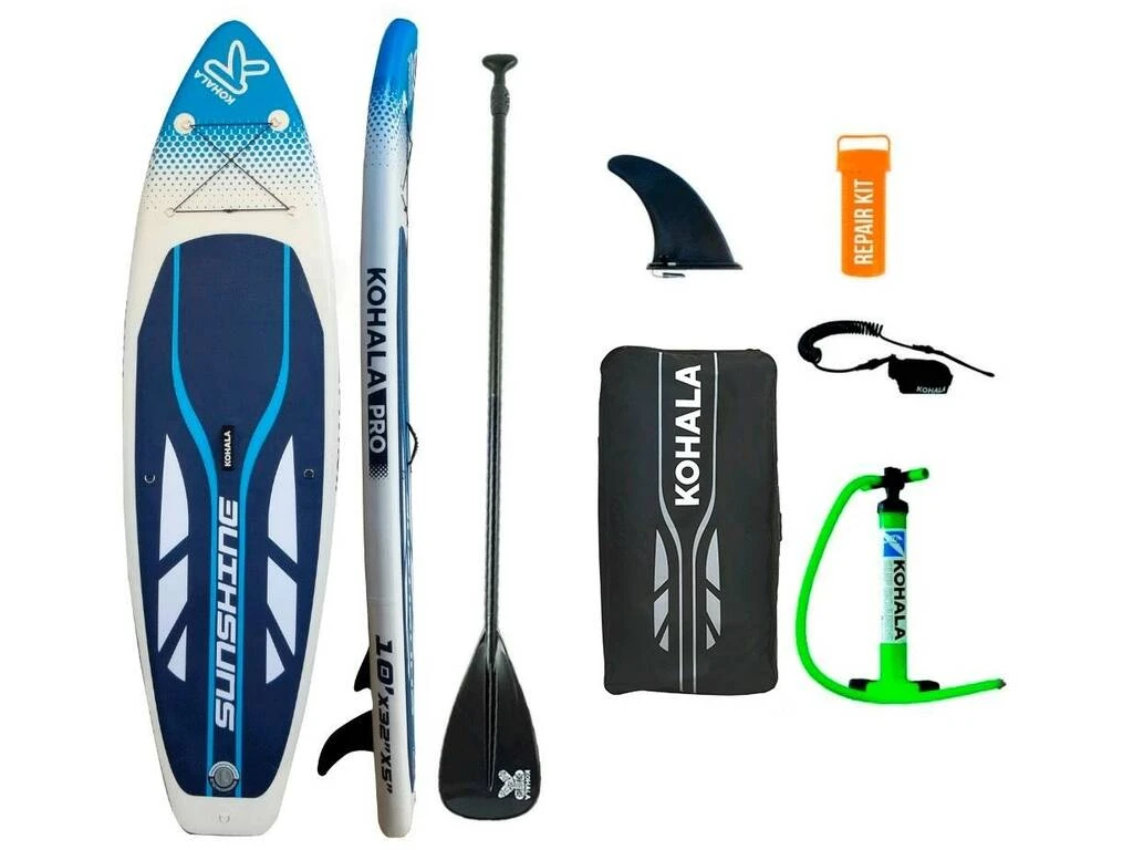– El pack incluye: 1 tabla hinchable de Paddle Surf Stad-Up Kohala Sunshine de color blanca y azul con 3 aletas (1 central y 2 laterales), 1 remo de aluminio telescópico, 1 bomba de hinchado manual simple, 1 bolsa de transporte, 1 correa especial elástica y 1 kit de reparaciones.