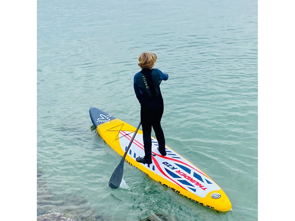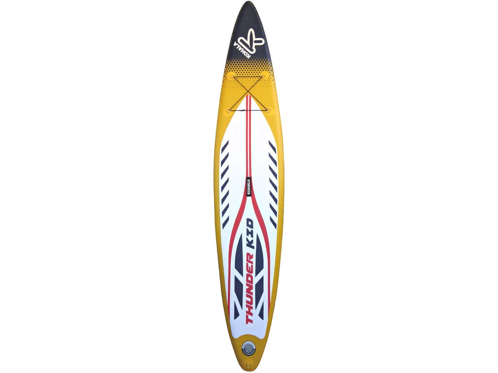 – El pack incluye: 1 tabla hinchable de Paddle Surf Stad-Up Kohala Thunder Race Kid de color amarilla con 1 aleta sistema Usbox, 1 bomba de hinchado de doble acción, 1 bolsa de transporte y 1 kit de reparaciones.